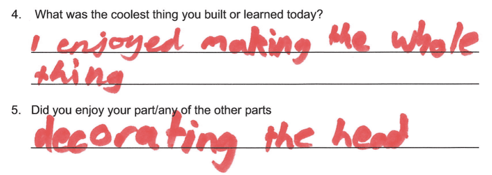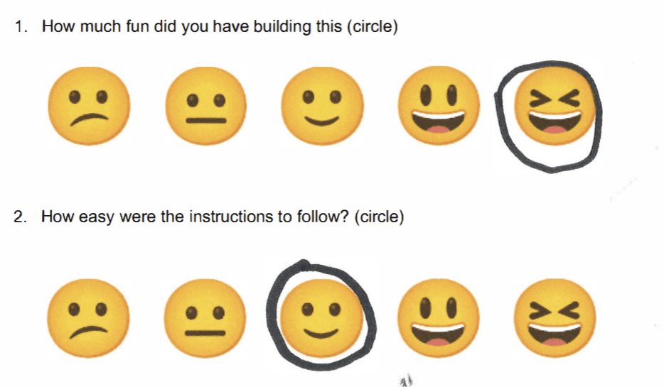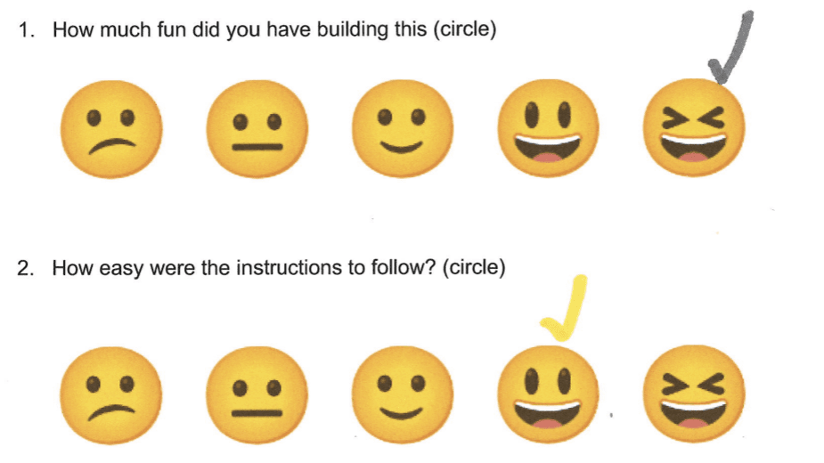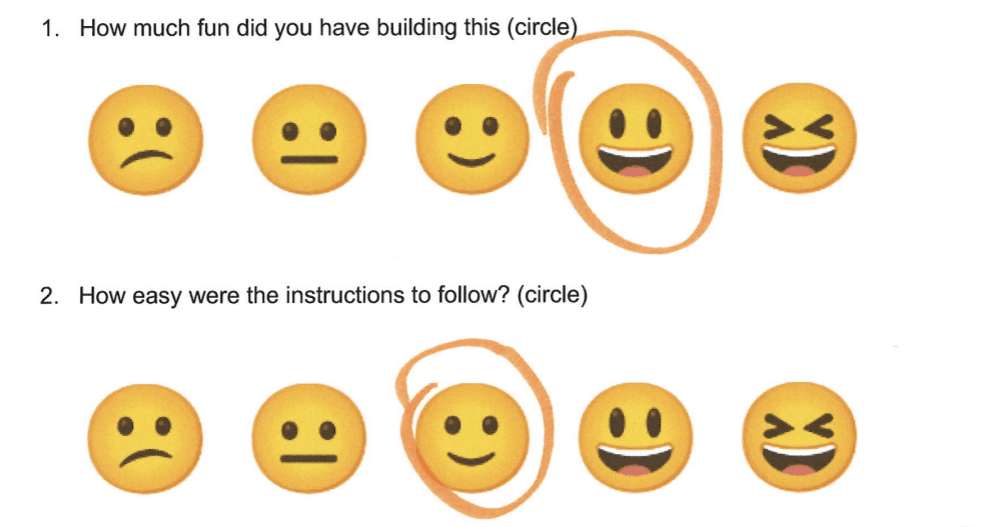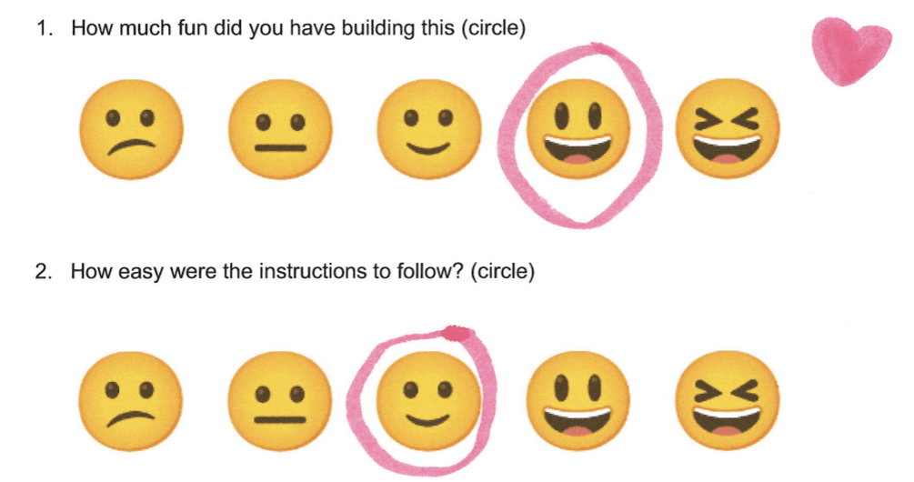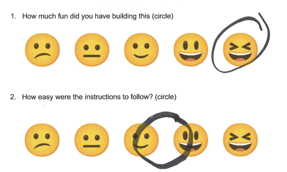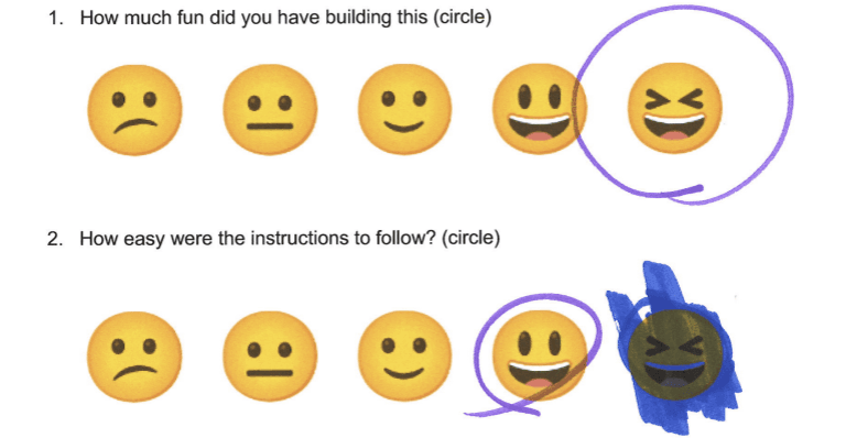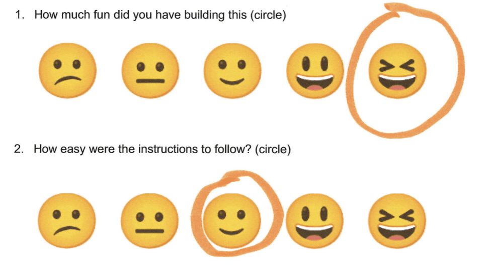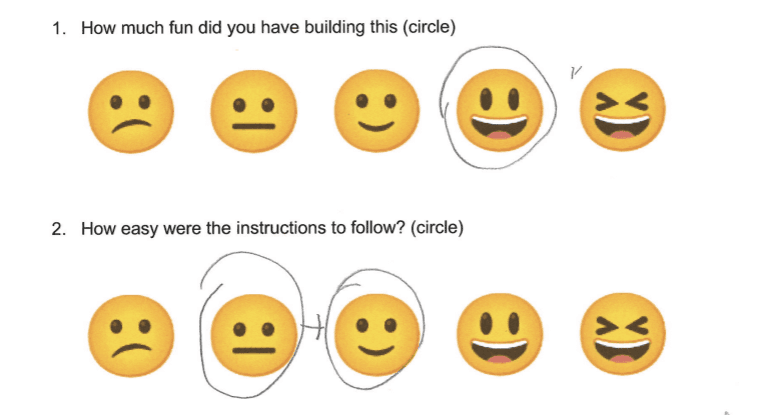 We designed a storyline to incorporate into the instructions, to assess whether it would make the instructions clearer and more engaging for the children to learn the different engineering concepts. The children ranked how much fun they had building the kit, and how easy the instructions were to follow.