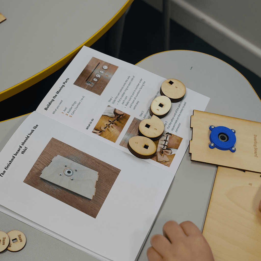 Children design what sits on top of their automata, transforming a mechanical build into something imaginative and uniquely their own.